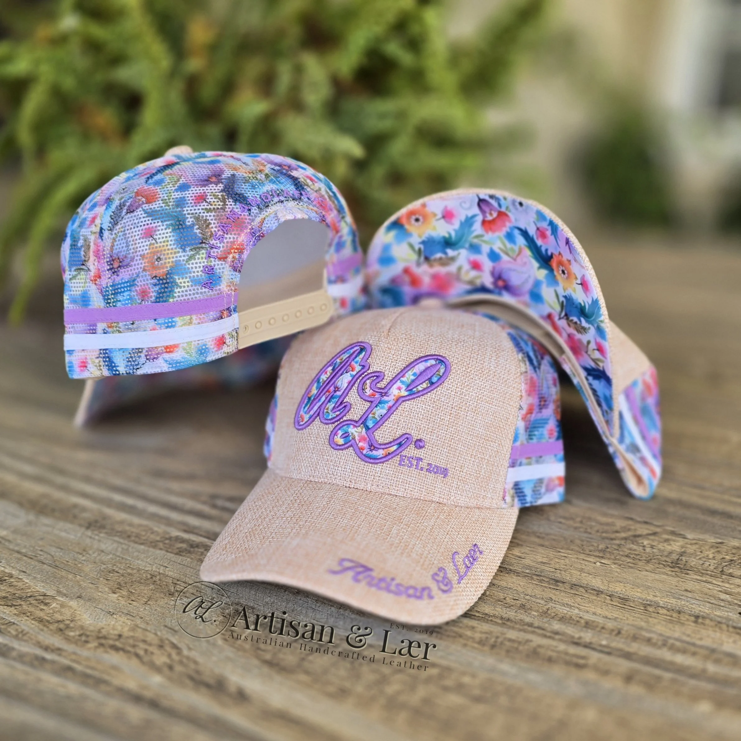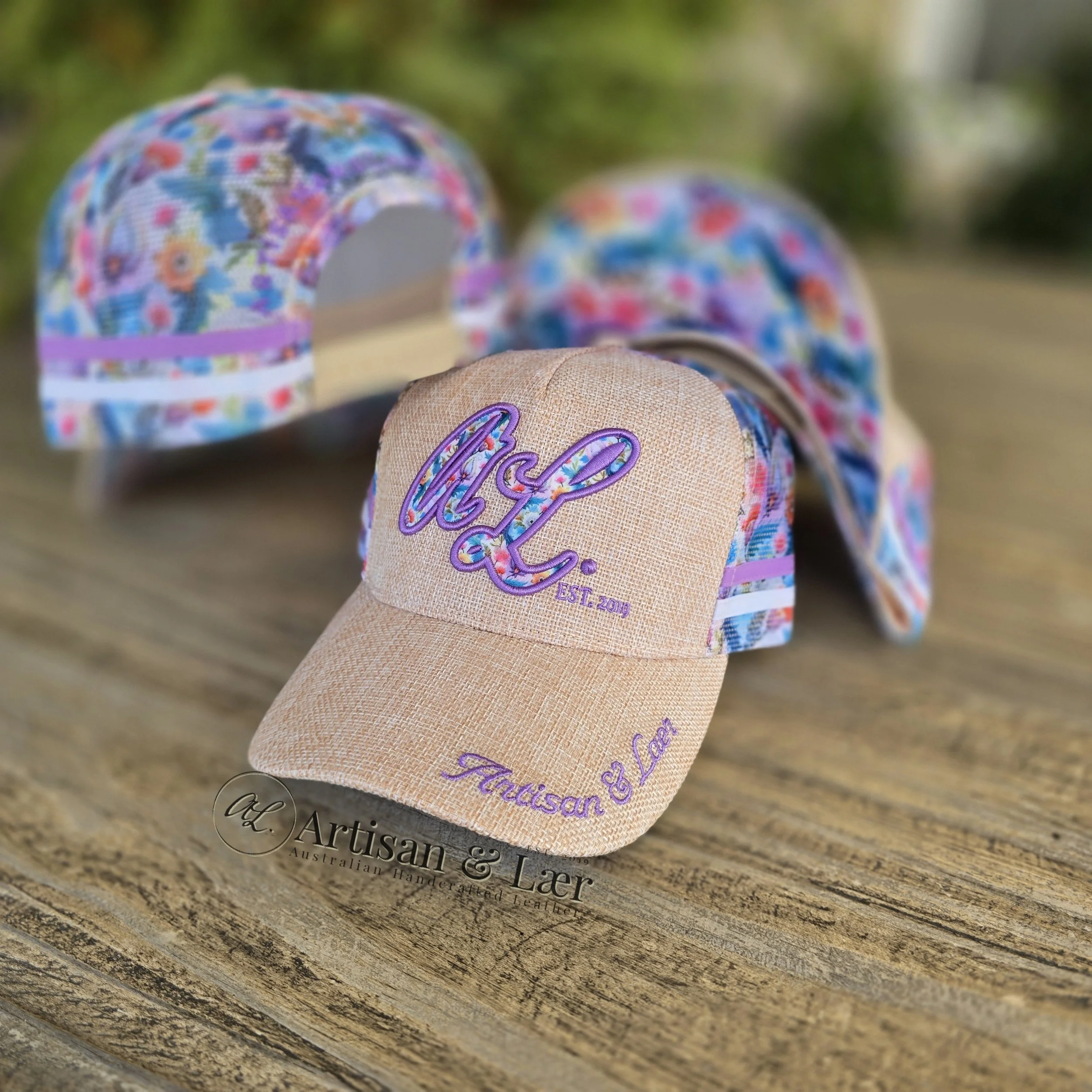 5-panel trucker caps featuring a linen-look crown paired with a purple paisley print, finished with embroidered A&L branding.
